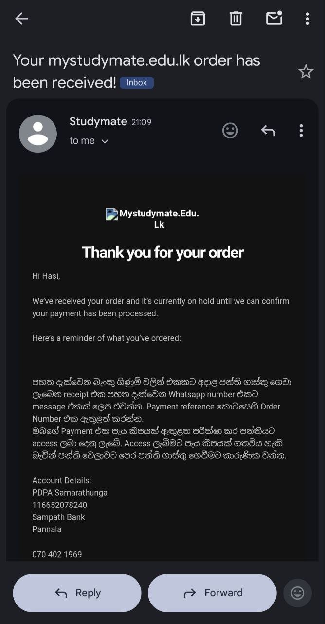 Order එක Complete වූ පසු ඔබට Email එකක් පැමිණේ. ( එය Spam Folder එකේ වුවද තිබිය හැක.)