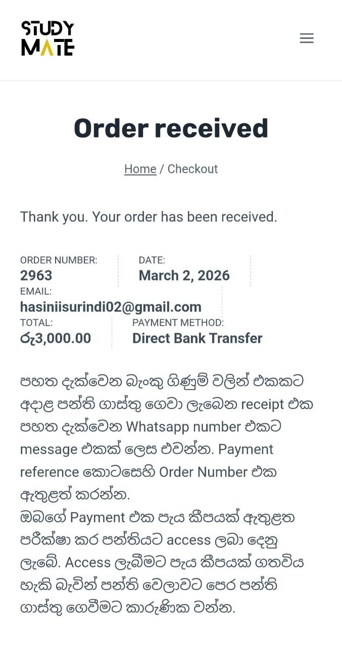 එම email එකේ ඇති ගිණුම් අංකයට අදාළ පන්ති ගාස්තුව බැර කළ යුතුය. Direct Bank Transfer මගින් මුදල් ගෙවීම කළ යුතුවේ. මෙය ඔබගේ ඕනෑම බැංකු app/website හරහා මෙන්ම බැංකුවකට ගොස් ද සිදු කළ හැක.
